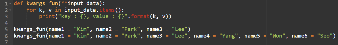 kwargs_fun(name1 = "Kim", name2 = "Park", name3 = "Lee", name4 = "Yang", name5 = "Won", name6 = "Seo")